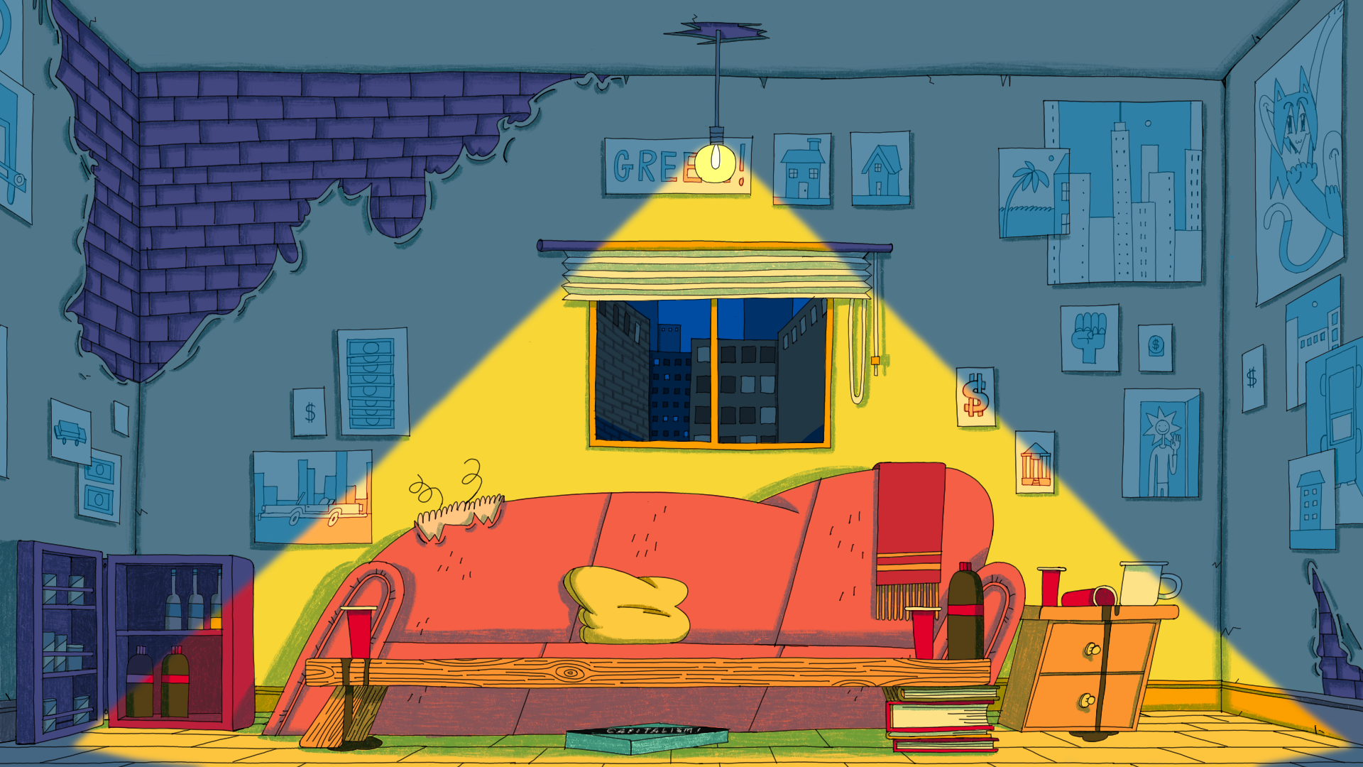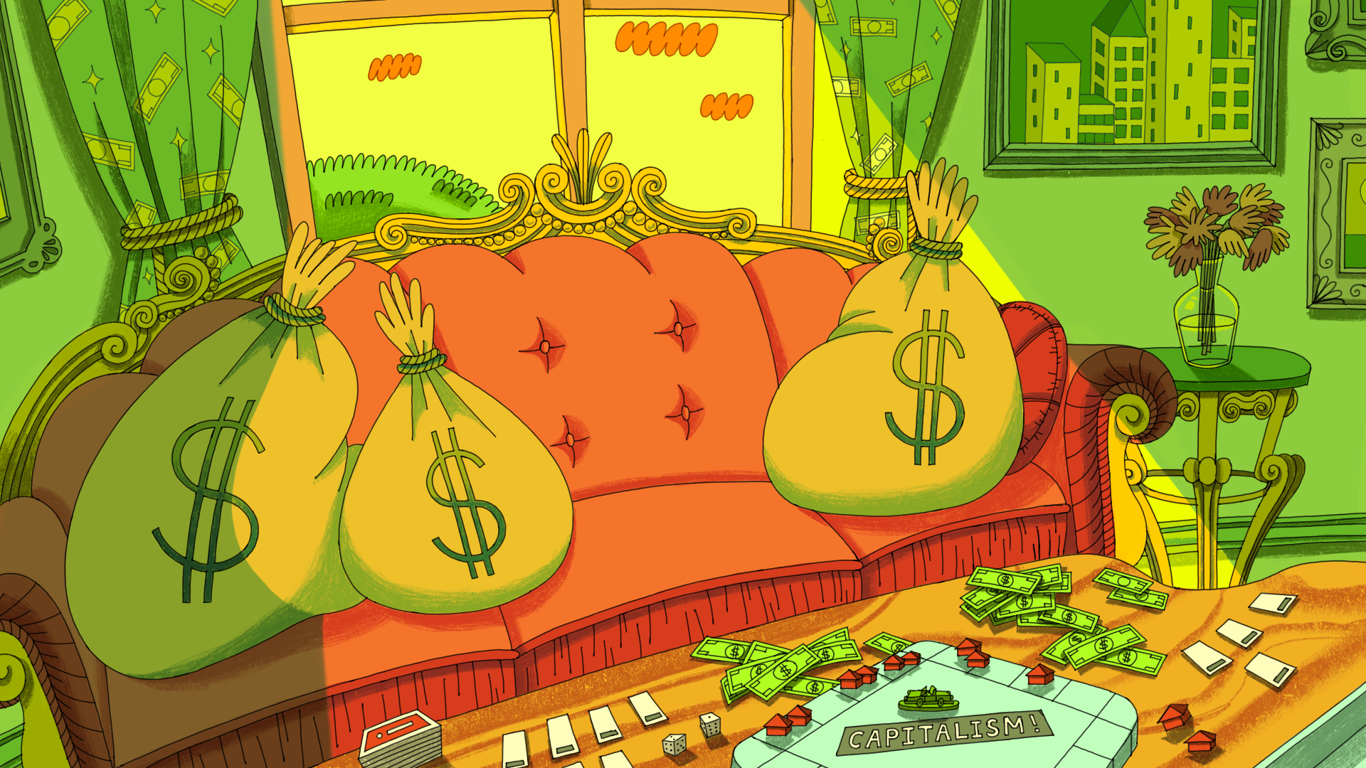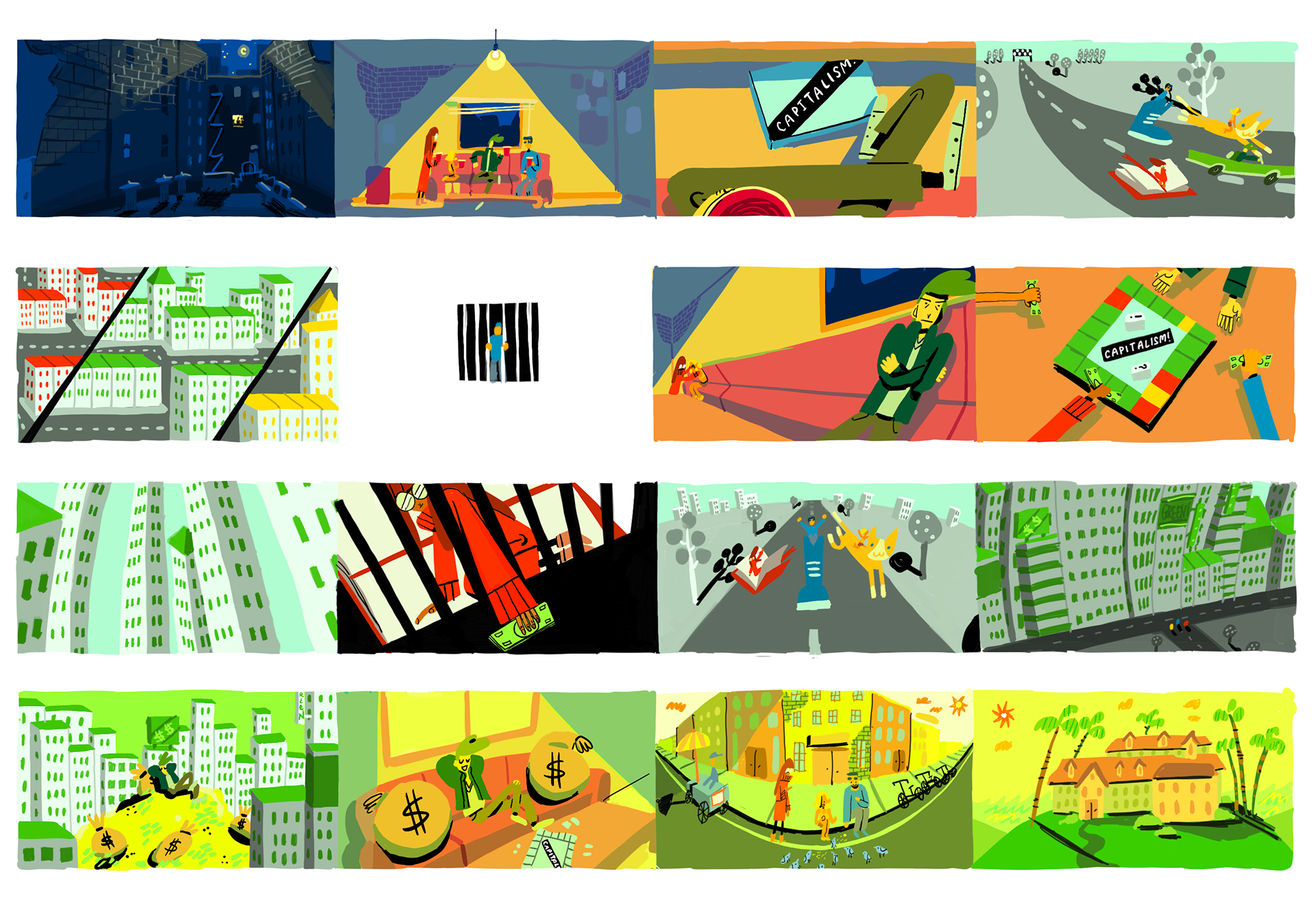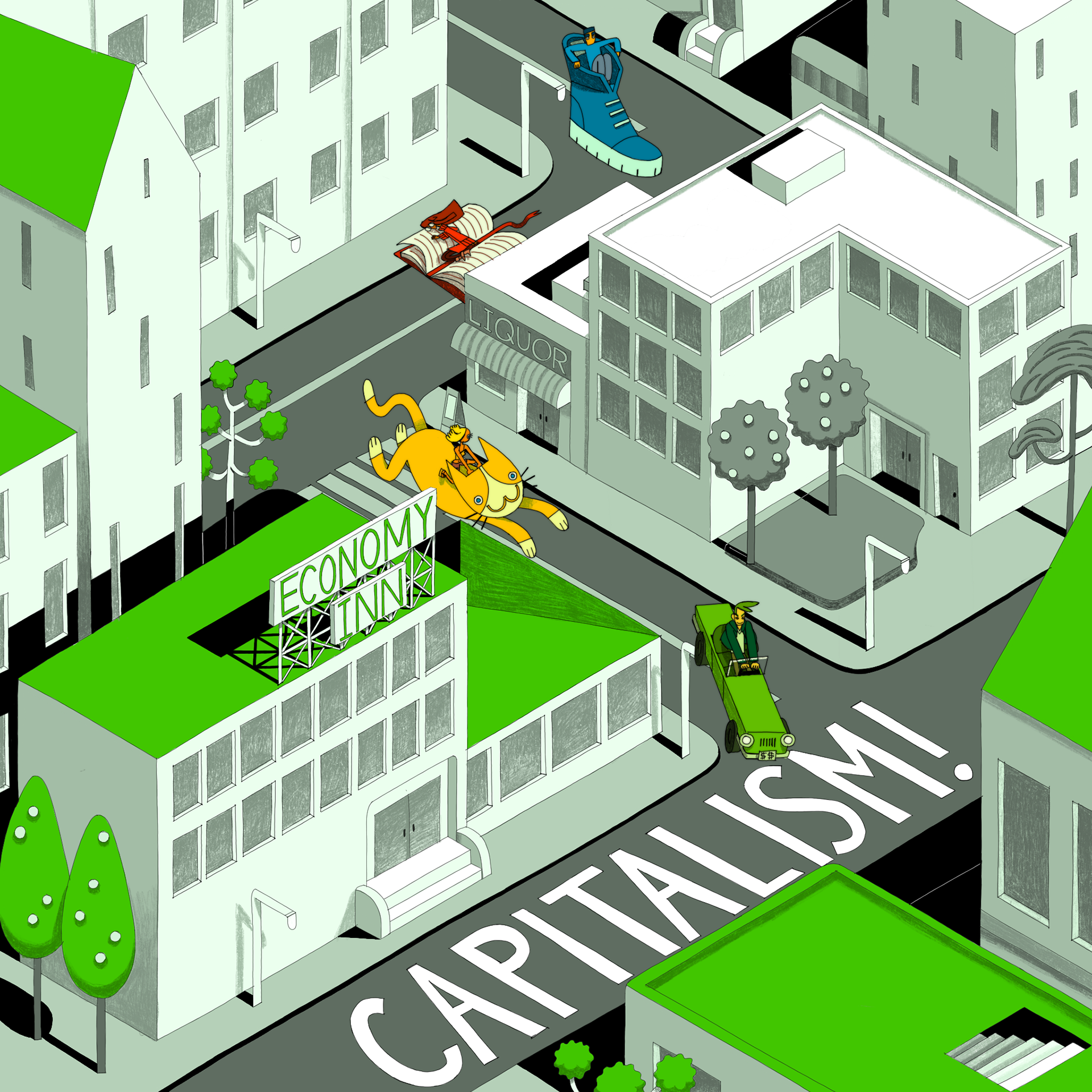 "CAPITALISM!" is about four friends who play a Monopoly-like board game called "CAPITALISM!". The game is depicted as an immersive world where each person travels through monochromatic streets in giant game pieces. The story takes a turn when one player becomes obsessed with winning.